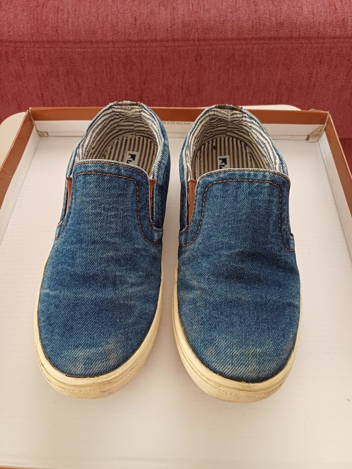 Mavi denim erkek çocuk loafer, batik desenli ve tokalı detaylı. Rahat ve renkli tasarıma sahip günlük ayakkabı.