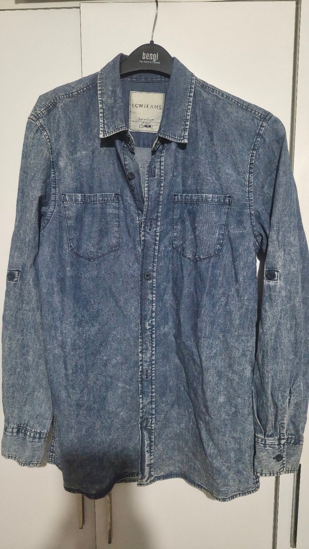 Bol kesim mavi denim erkek gömlek, düğmeli ön ve çentikli yaka ile. Uzun kollu, göğüs cepli, günlük rahat sokak stili için uygundur. CWJEAN markalı.