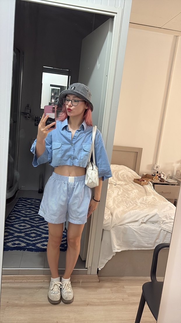 Bağlama desenli, pastel mavi renkli, bol kesim mini denim şort, günlük kullanım için rahat ve şık bir sokak stili sunar.