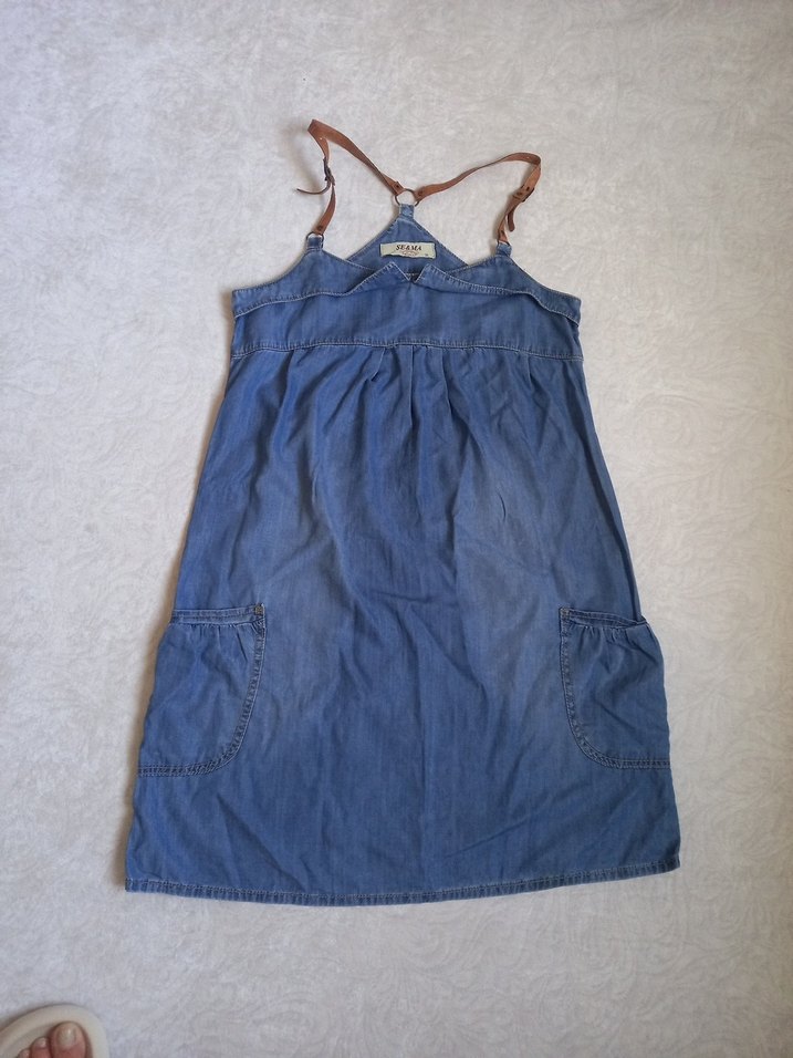 Pastel mavi denim kumaştan, bol kesim, askılı ve tokalı midi elbise. Günlük kullanım için bohem tarzda rahat bir modeldir.
