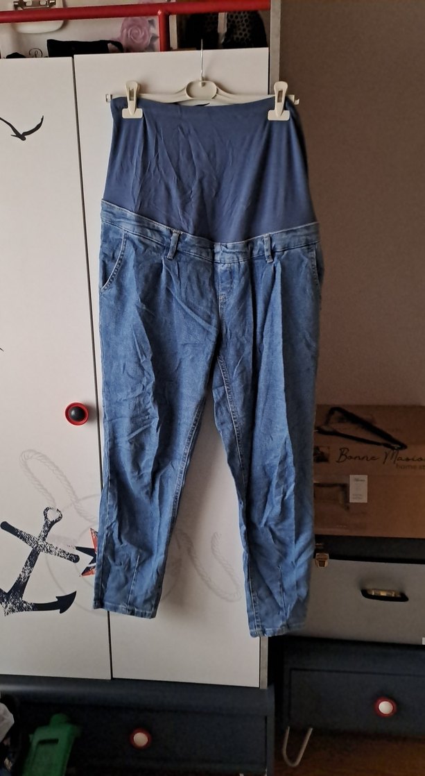Mavi denim hamile pantolonu, rahat kesim ve normal boyda. Esnek bel kısmı ve kemerli tasarımıyla ayarlanabilir. Günlük sokak stiline uygun.