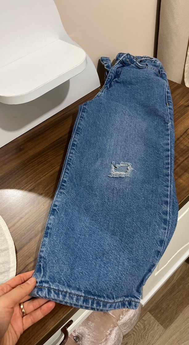 Mavi denim midi boy, regular fit, tokalı bel detaylı jean. Günlük kullanıma uygun, parlak görünümlü ve küçük yıpranmış alanlı jean.