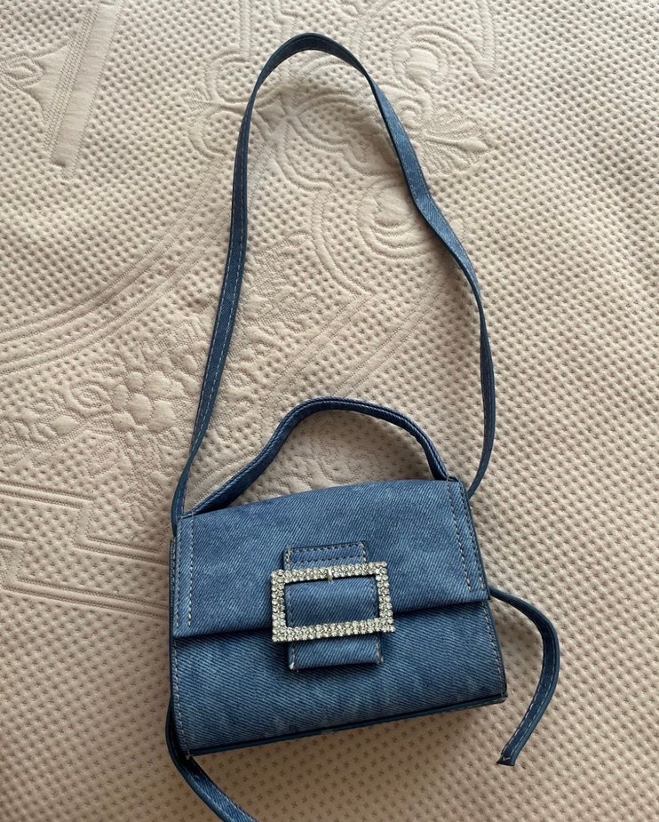 Mavi denim kumaştan kadın çanta, yılan derisi desenli ve taşlı tokalı kapaklıdır. Uzun askı ve kısa sap bulunur. Bohem Paris tarzında, günlük kullanıma uygundur.