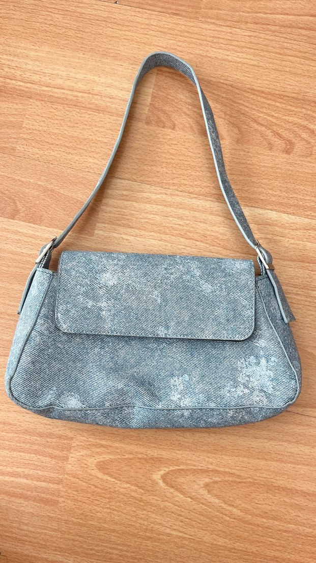 Mavi denim kumaştan, bağlamalı desenli ve tokalı kapaklı kadın çantası. Minimalist ve bohem tarzıyla günlük kullanıma uygundur.