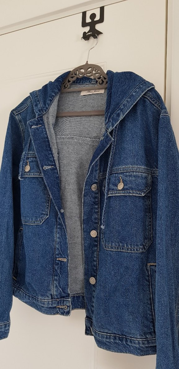 Düğmeli, bol kesim mavi denim ceket, normal midi boyda, uzun kollu ve kesik yakalıdır. Günlük kullanıma uygun, sade ve rahat bir sokak stili ceket.