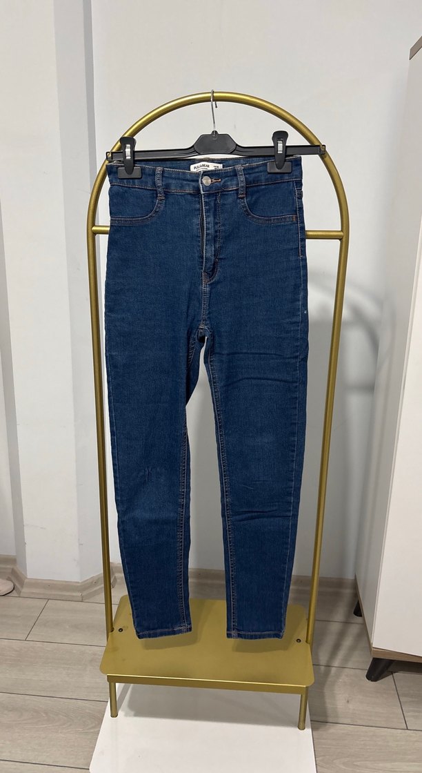 Mavi, parlak görünümlü ve baskılı detaylara sahip dar kesim denim kadın jean, günlük sokak stili için midi boyda, zahmetsiz şıklık sunar.