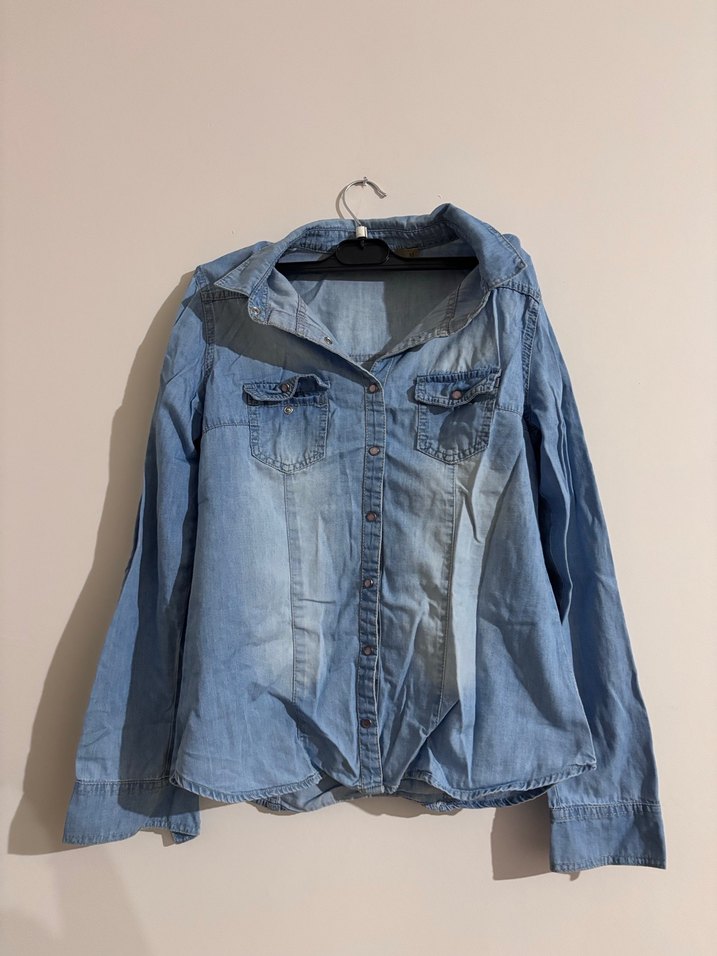 Düğmeli, yakalı ve uzun kollu mavi denim gömlek. Günlük kullanım için uygun, rahat sokak stili