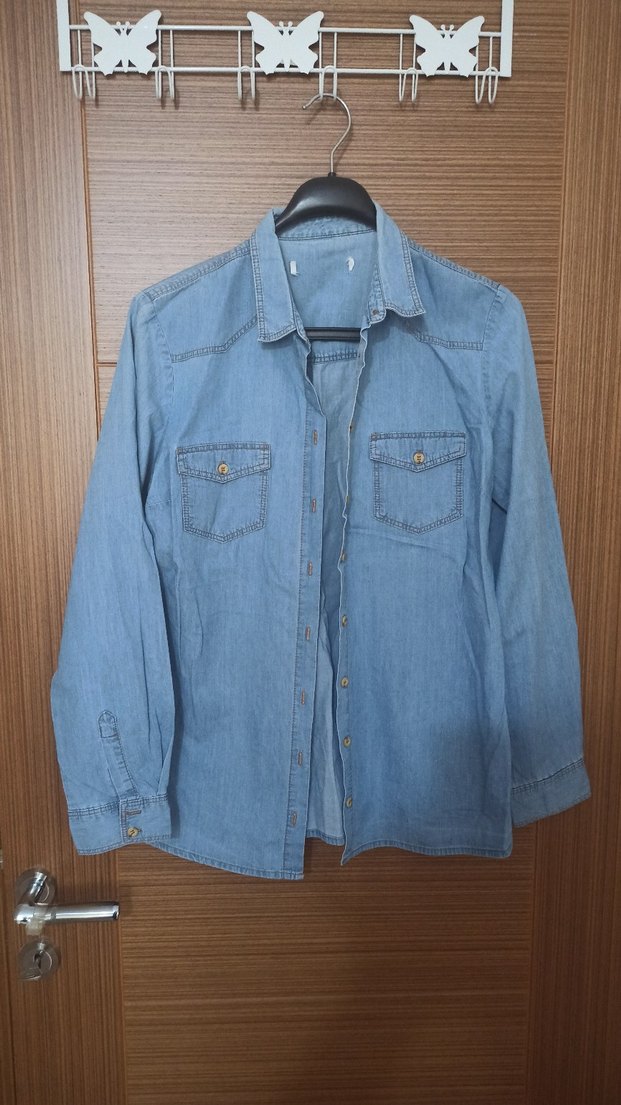 Pastel mavi renkte, düğmeli, uzun kollu denim kadın gömleği. Regular fit, çıtçıtlı ve iki cep detaylı, günlük rahat kullanıma uygun.