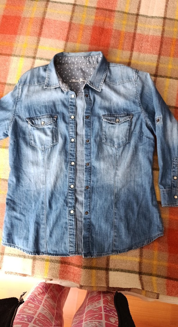 Mavi denimden üretilmiş, çıt çıtlı , yakalı ve yarım kollu kadın gömleği. dar kesim ve iki göğüs cebi ile günlük sokak stiline uygundur. Eskitilmis görüntüsü ile orjinal kot gömlek