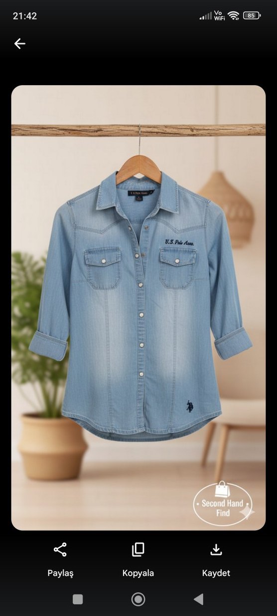Mavi denim kadın gömlek, uzun kollu ve düğmeli. Notlu yaka, baskılı detaylar ve iki cep içerir. Günlük rahat kullanıma uygun parlak yüzeyli.