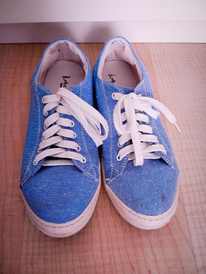 Mavi denim kadın spor ayakkabılar, düz taban ve sade tasarıma sahip, günlük rahatlık ve sokak stiline uygun. Pastel tonlarıyla şıklık katıyor. Ufak tefek lekeleri var. fiyatı o yüzden uygun.