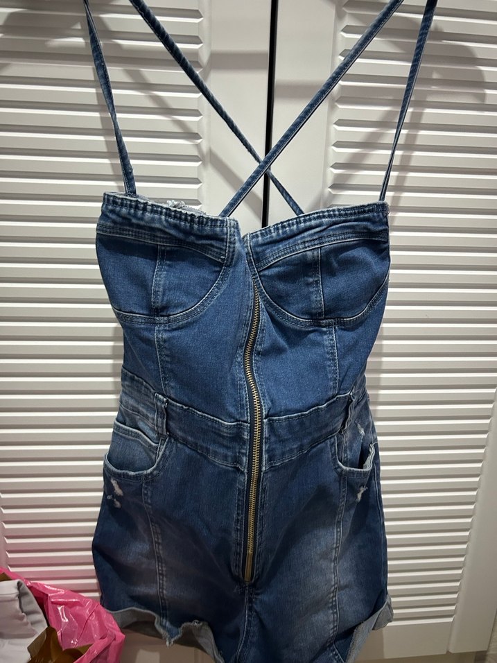 İnce askılı, önden fermuarlı mavi denim kadın kısa salopet. Vücuda oturan kesimi ve normal midi boyu ile sokak stiline uygundur. Günlük kullanım için idealdir.