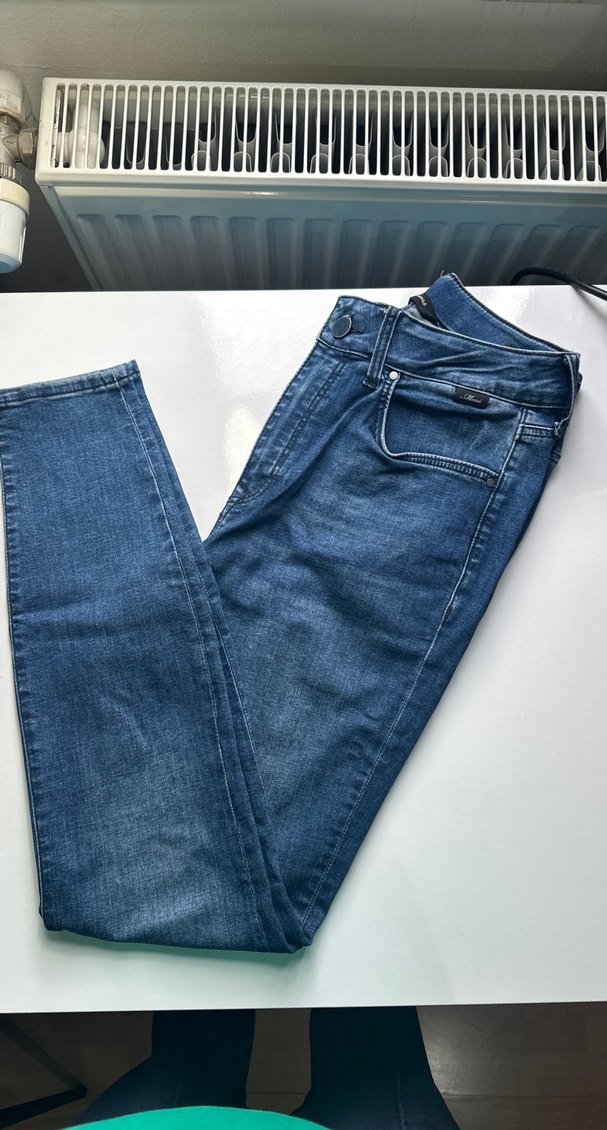 Mavi denim, regular fit, midi boy kadın jean. Sokak stili, tokalı detaylı, günlük kullanıma uygun sade tasarım.