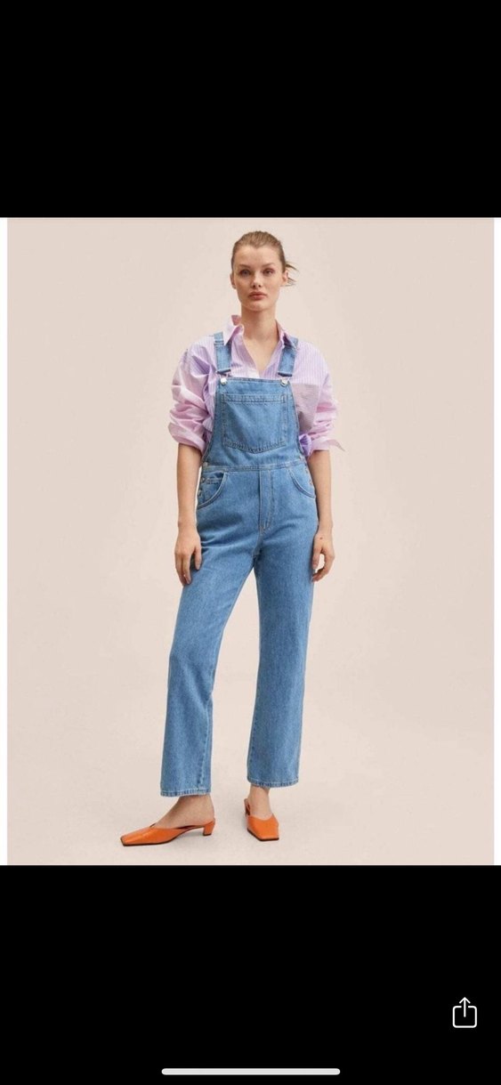 Mavi denim kumaştan, regular fit ve midi boyda kadın tulum. Askılı, bisiklet yaka ve hafif batik desenli, günlük kullanıma uygun rahat bir model.