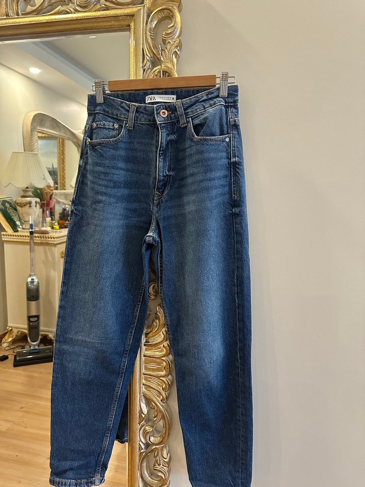 Mavi denim kadın kot pantolon, regular fit ve normal boyda. Günlük kullanım için uygun, parlak görünümlü ve tokalı detaylı sokak stili pantolon.