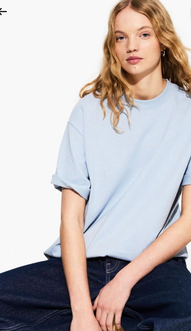 Pastel mavi denim kadın tişörtü, kısa kollu ve yuvarlak yakalıdır. Salaş kesimi ve normal boyu ile rahat ve şık bir günlük stil sunar.