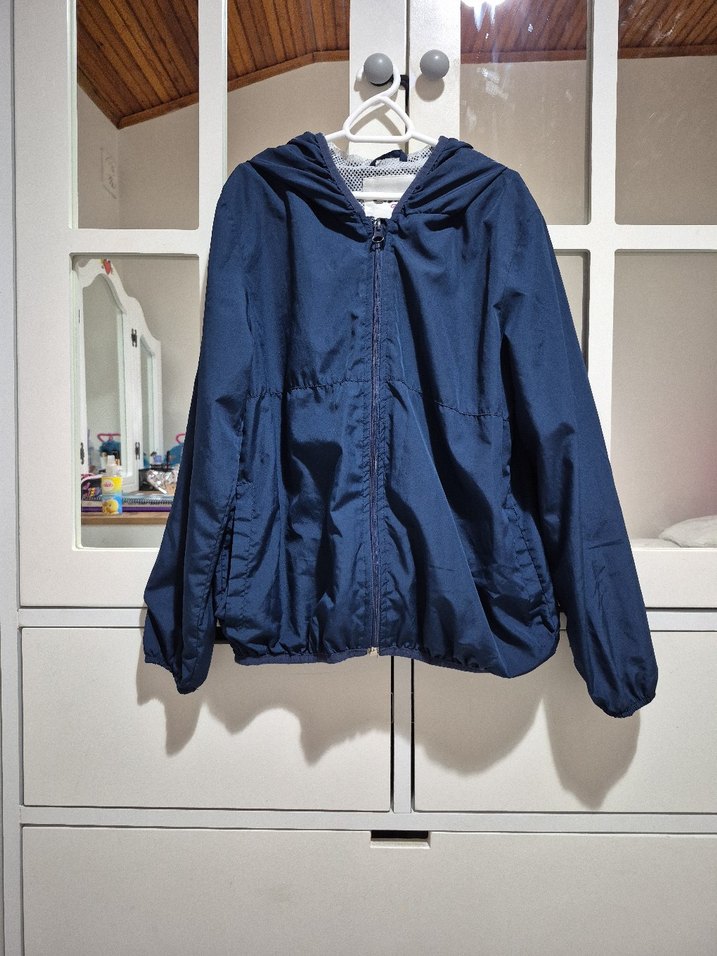 koyu mavi denim ceket, kapüşonlu ve fermuarlı. Uzun kollu, bol kesim ve midi boyda, günlük sokak stiline uygun minimal tasarım. 11-12 yaş yazıyor ama 7-8 yaşta kullandık