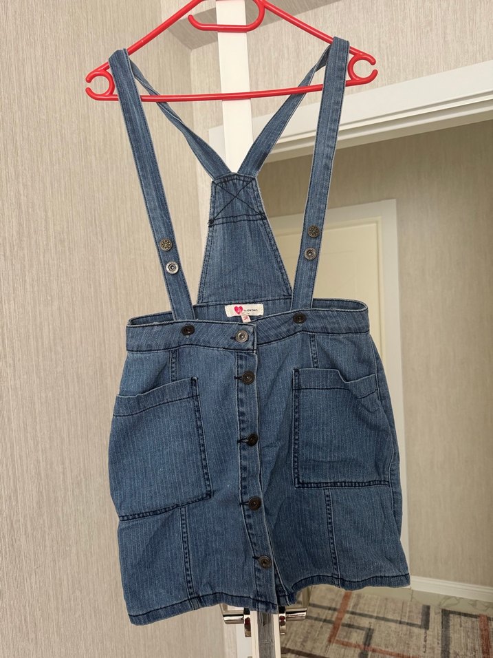 Hiç giyilmedi❗️Mavi denim kısa askılı kadının önü düğmeli, kemerli ve büyük cepli tulumu. Trend sokak stili için uygun, rahat ve şık.