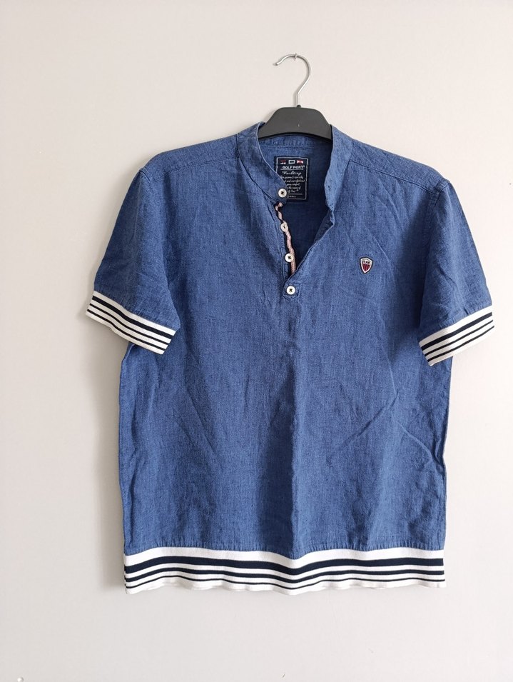 Mavi denim kumaştan, kısa kollu, düğmeli ve yakalı erkek gömleği. Salaş kesim ve kol ile etek kısmında çizgili detaylar bulunur. Günlük sokak stili için uygundur.