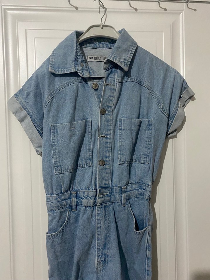 Mavi denim kumaştan, kısa kollu ve yakalı, düğmeli, cepli, bol kesim kadın tulumu. Günlük rahat kullanıma uygun.