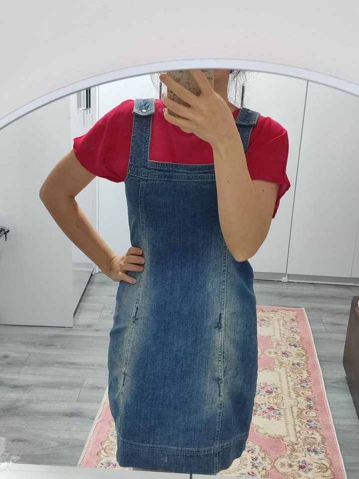 Fitted kesim, mavi denim kısa salopet elbise, günlük kullanım için rahat ve şık bir sokak stili sunar. (sadece arka sol tarafta minik bi leke mevcuttur)