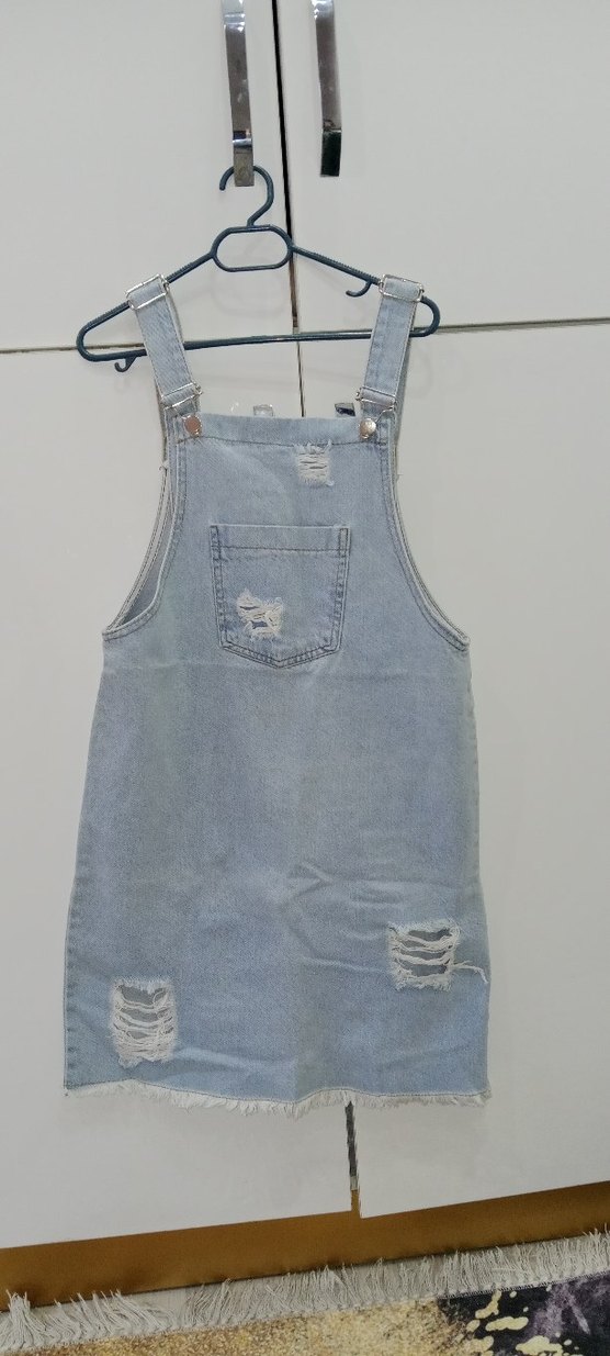 Bol kesim, askısız mavi denim kısa tulum elbise, tokalı askılar ve yırtık detaylarla. Günlük kullanım için rahat sokak stili.