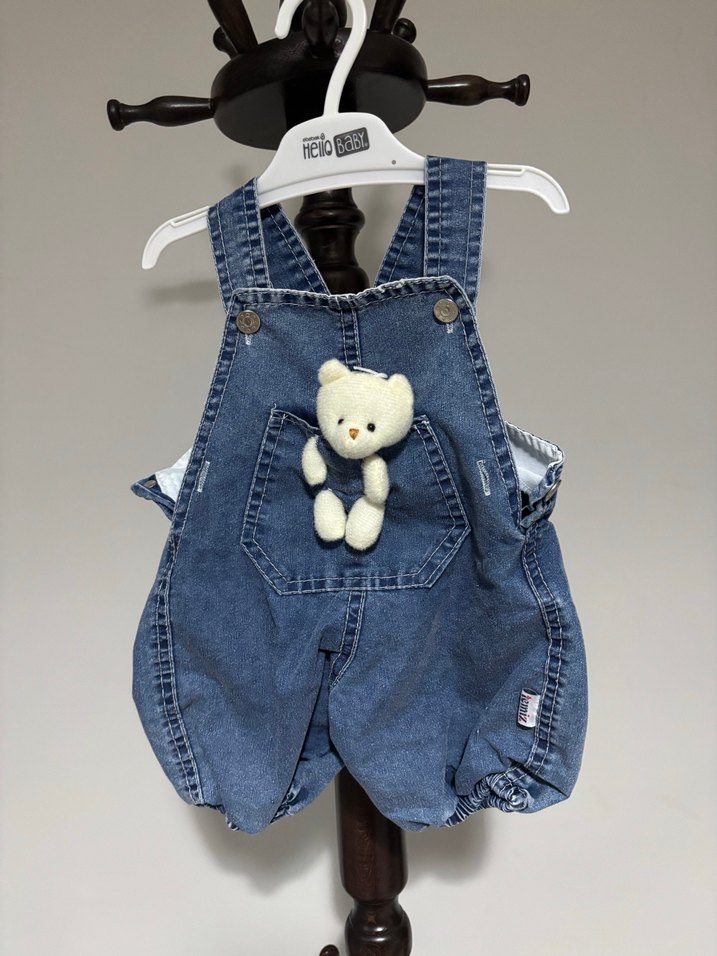 Ayarlanabilir tokalı askılara ve ön ceplerde küçük bir oyuncak ayı süsüne sahip, bol kesim mavi denim kız çocuk tulumu.
