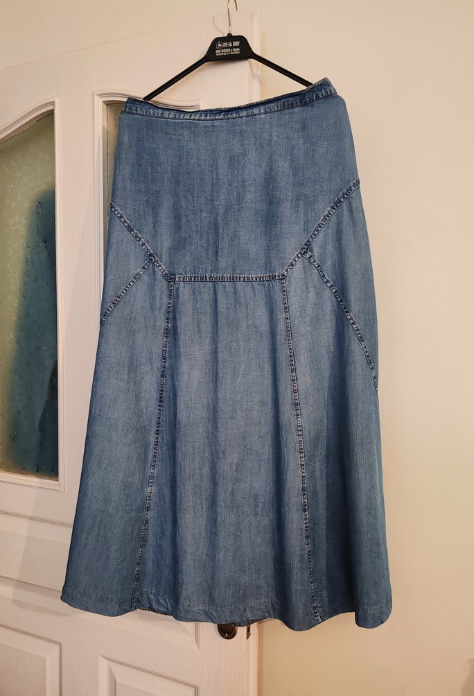 Mavi denim maxi uzun etek, evaze kesimdir. Desensiz yapısıyla günlük kullanıma uygun rahat bir stil sunar. Marka Gazella. Rengi ilk iki resimdeki gibi ama daha güzel, beyazlıklar yok. Beline iki küçük pens dikmiştim, açılabilir. Dökümlü, tensel gibi kumaşı iç göstermez. Güzel günlerde giyilsin..