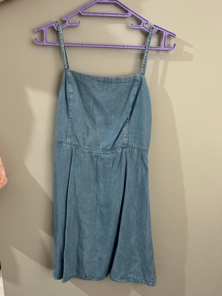 Mavi pastel tonlarda denim midi elbise, askılı ve straplez yaka, pilili etek detayıyla bol kesimdir. Rahat ve günlük kullanım için uygundur. bir kez giyildi temizdir 10-11 yaş için uygundur