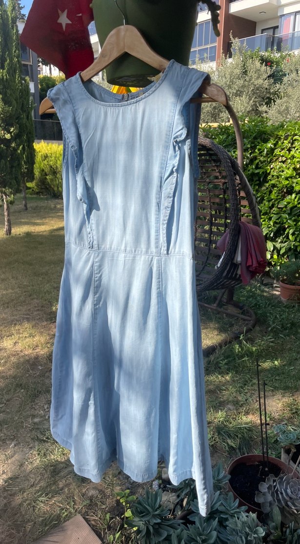 Hafif yumuşak denim kumaştan, mavi pastel tonlarda, kolsuz, drapeli ve salaş kesimli midi elbise. Yuvarlak yakalı, bohem tarzda, açık hava kullanımı için uygun.