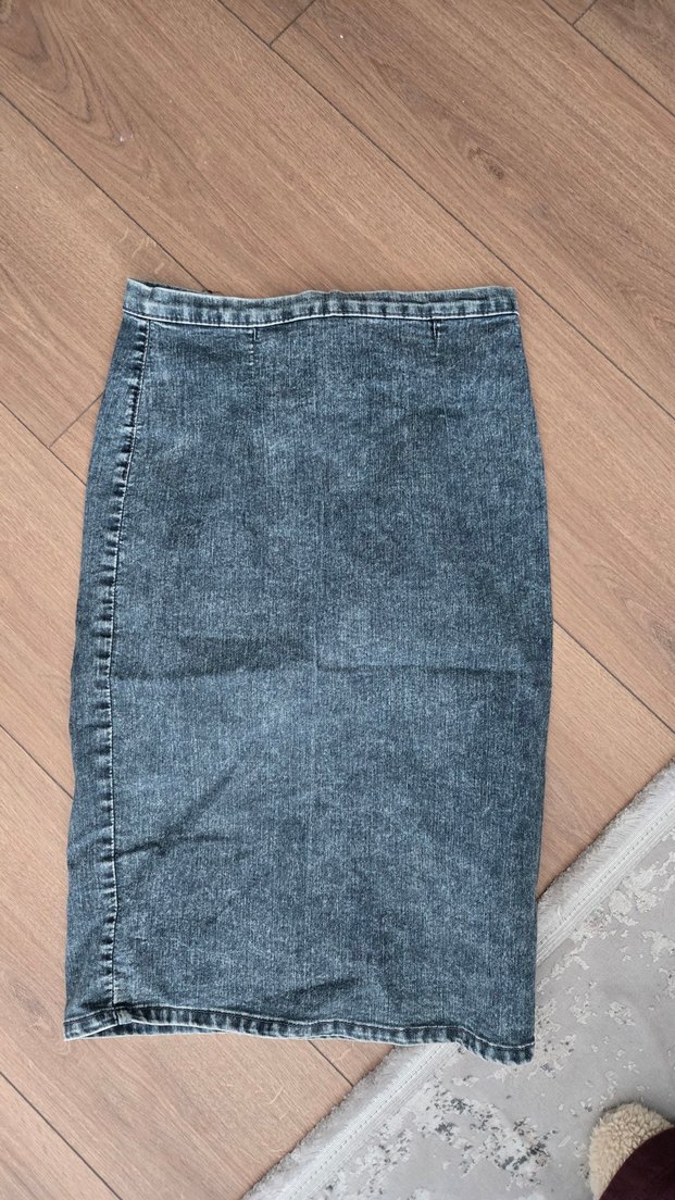 Mavi ve gri tonlarında denim kumaştan, dar kesim ve midi boyda etek. Günlük kullanıma uygun sade ve rahat bir model.