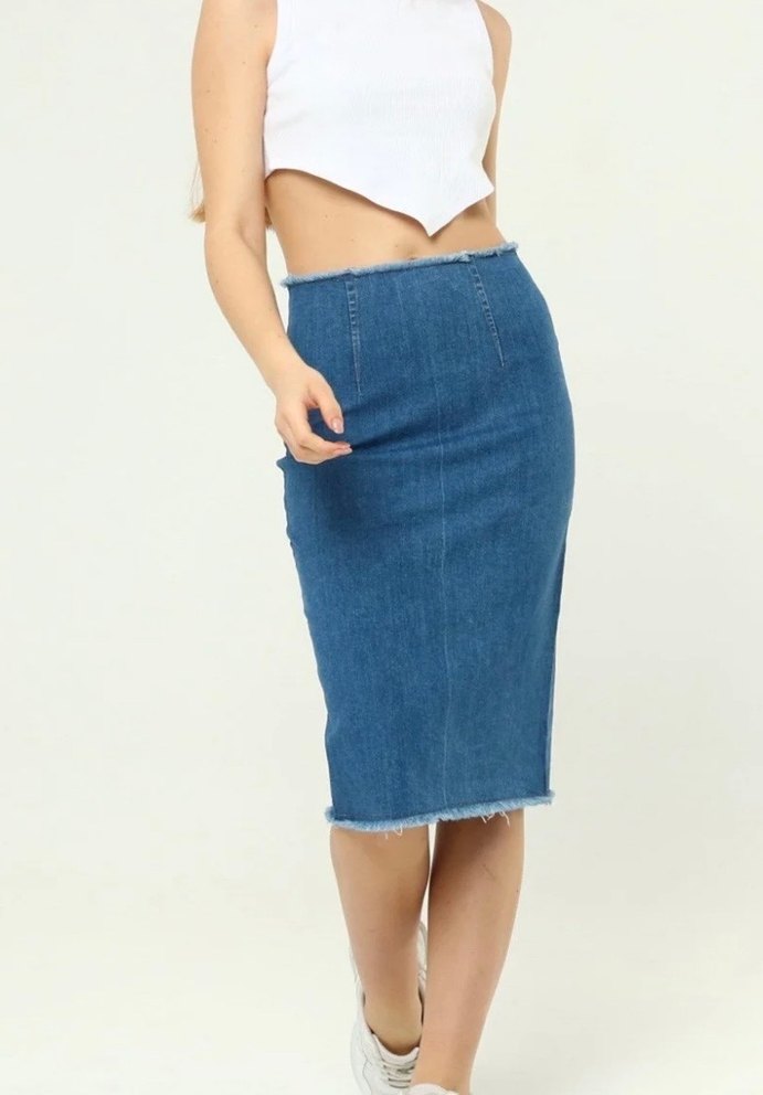 Bu mavi denim midi kalem etek, günlük sokak stili için zahmetsiz şıklık sunar. Hafif mavi tonunda ve desensizdir.