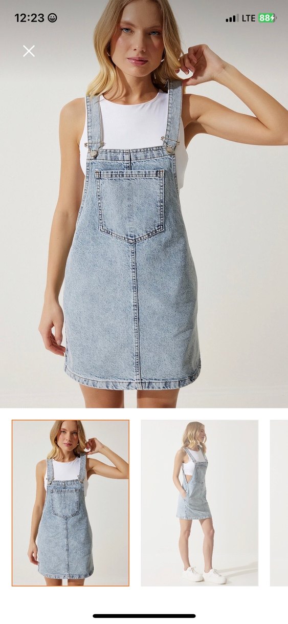 Mavi denim midi salopet elbise, salaş kesim, askısız ve kolsuz tasarımıyla rahat ve şık bir sokak stili sunar. Günlük kullanım için uygundur.