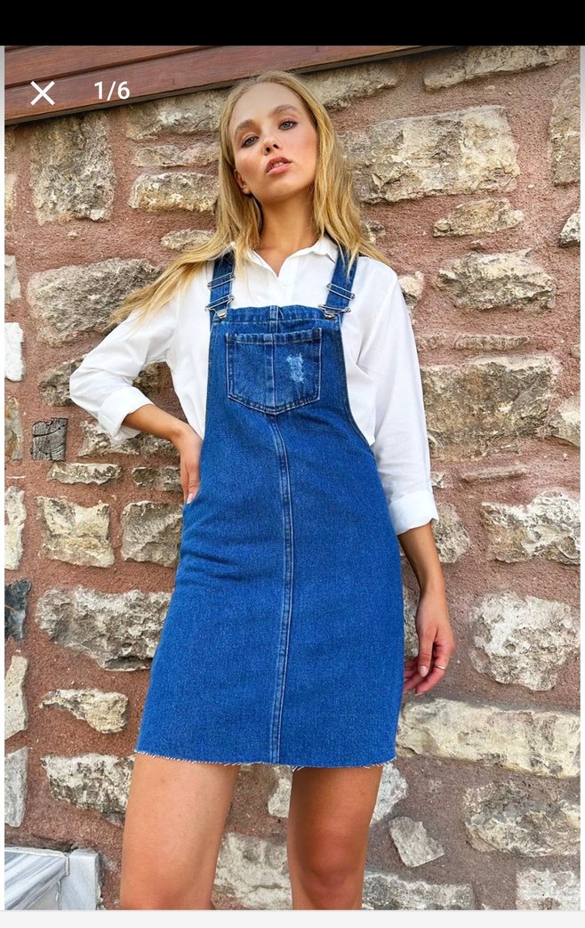 Mavi denim midi uzunlukta, askılı ve salaş kesim salopet elbise, rahat ve şık bir günlük sokak stili sunar.
