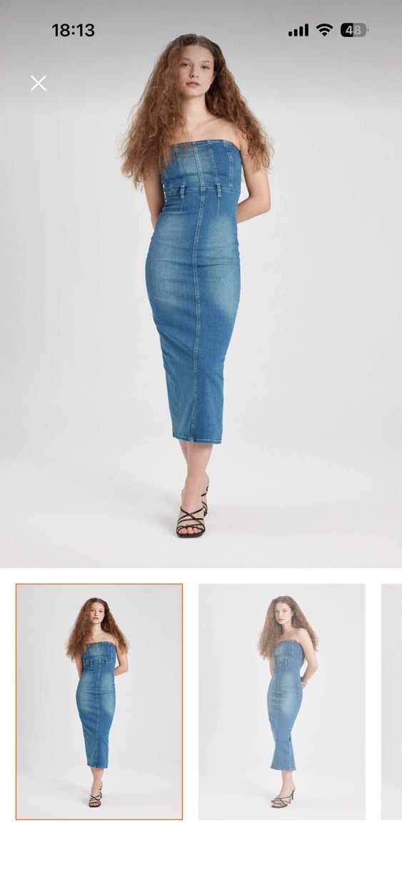 Bu açık mavi denim midi elbise, straplez yakası ve ince askılarıyla vücuda oturan kesimiyle günlük kullanıma uygun rahat ve şık bir görünüm sunar.
