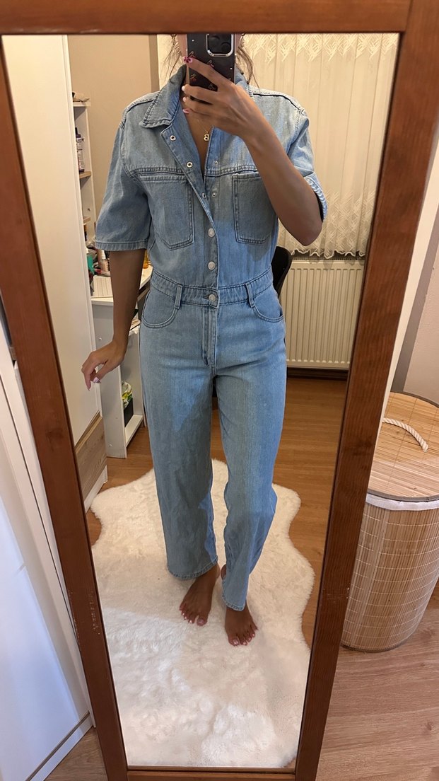 Mavi denim midi tulum, kısa kollu ve düğmeli. Normal kesim, yakası kesik yakalıdır. Günlük sokak stili için uygundur.