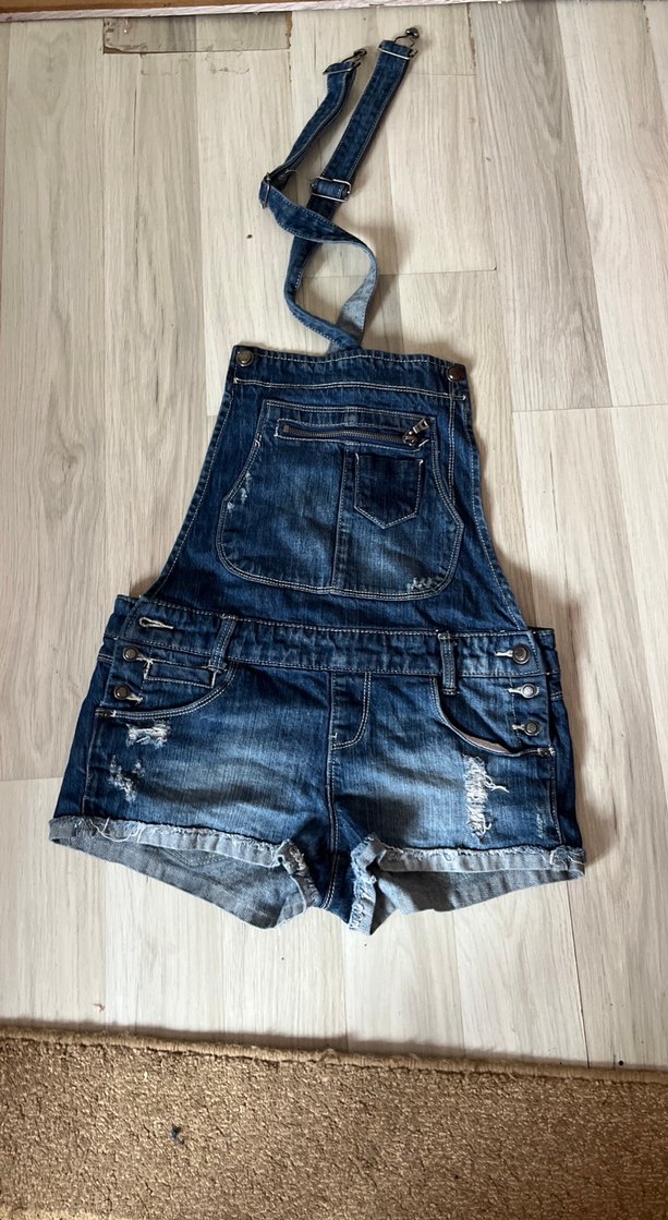 Mavi denim kısa şort tulum, bol kesim ve askısız yakalı, tokalı askılar ve yıpranmış detaylarla rahat sokak stili için uygun.