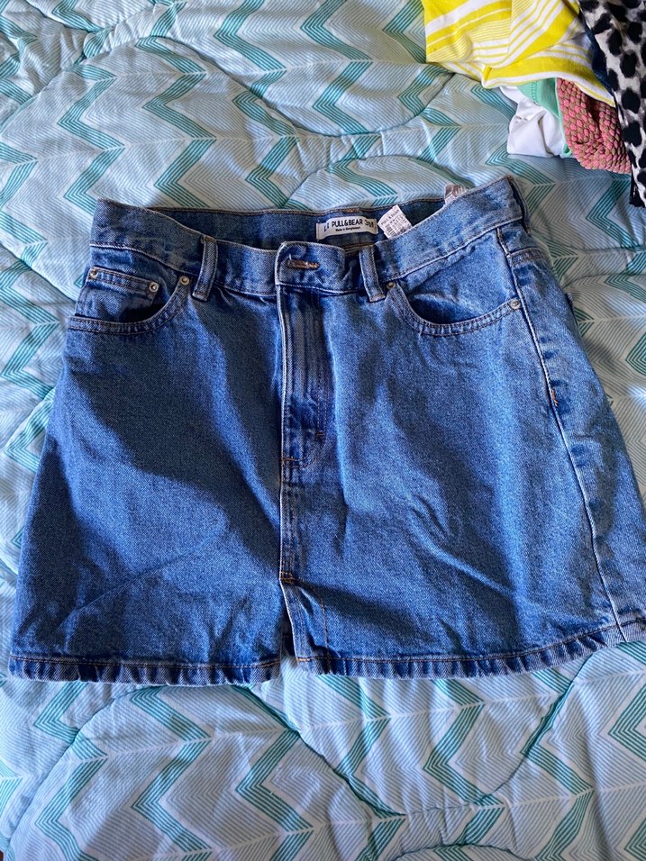 Günlük kullanım için rahat, bol kesim mavi denim mini etek. Klasik, desensiz ve zahmetsiz şıklık sunar.