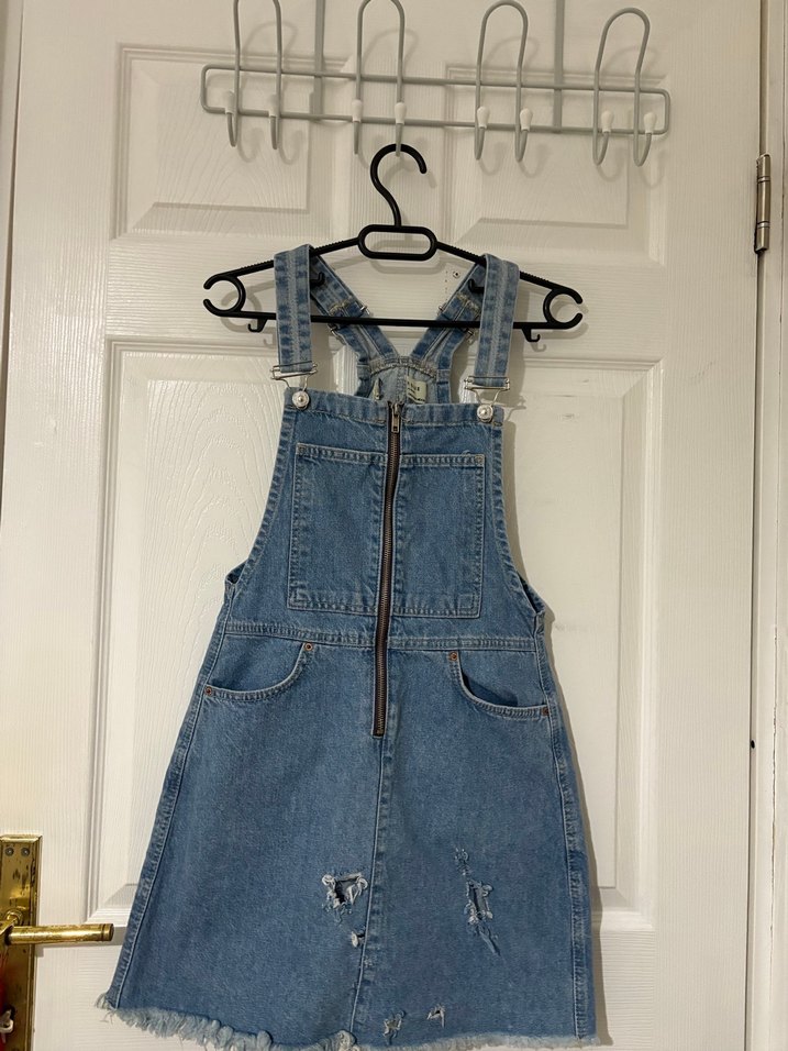 Mavi denim kısa tulum, önde fermuar, ayarlanabilir tokalı askılar ve yırtık detaylı. Günlük sokak stili için uygun.