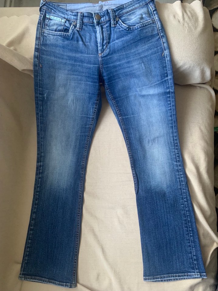 Mavi denin, normal boy ve regular fit kesime sahip, tokalı kadın kot pantolon. Desensiz ve günlük kullanıma uygun. düşük bel ve ispanyol paça görünümü.