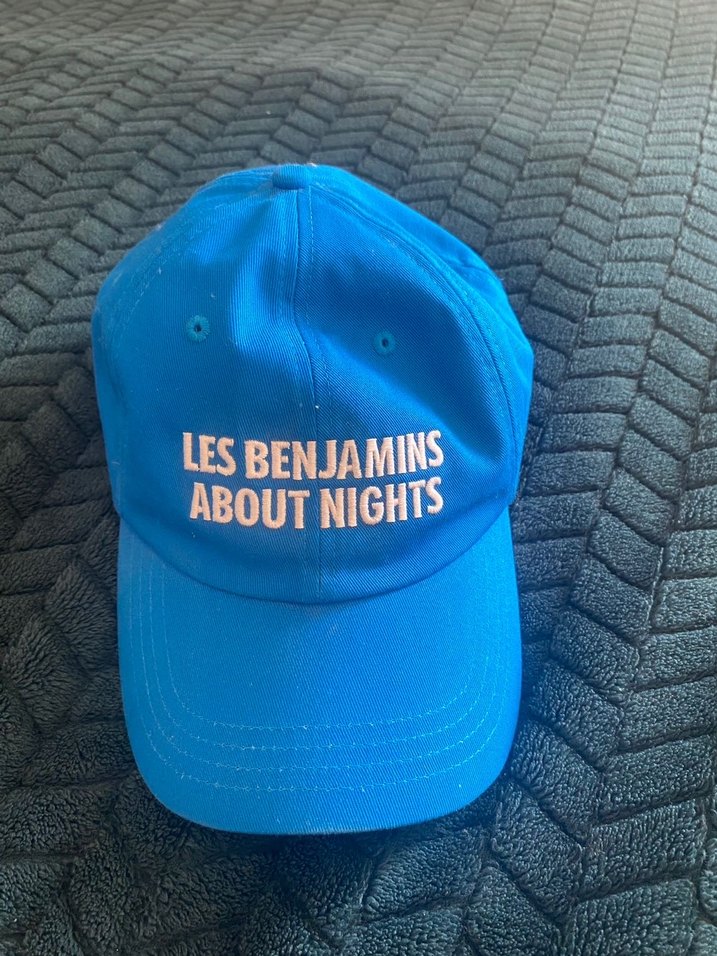 Mavi denim kumaştan, tokalı ayarlanabilir bantlı şapka. "LES BENJAMINS ABOUT NIGHTS" nakışlı, sokak giyimi ve athleisure tarzına uygun. Önde kücük bir sarı iz gibi bir İey var gösterdim iç tarafında hediye geldiğinde öyleydi