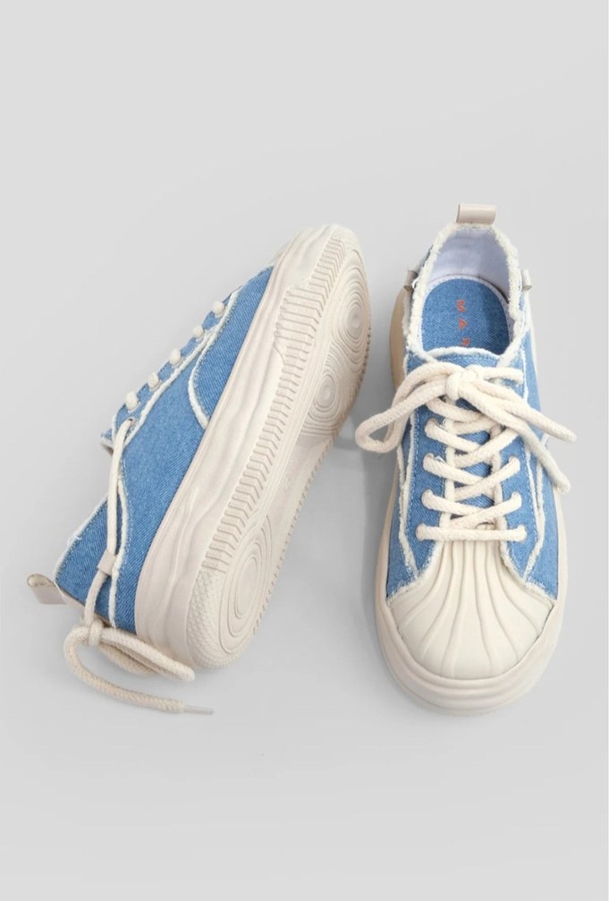 Ruffled detaylı, bağcıklı mavi denim spor ayakkabılar, stiletto topuklu ve tie-dye desenli. Günlük kullanıma uygun rahat tasarım.