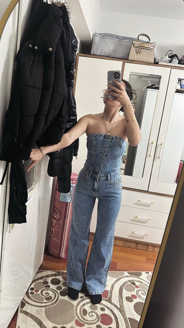 Mavi denimden yapılmış, straplez yaka ve tokalı detaylara sahip, normal midi boyda, sıkı kesim tulum. Sokak modasına uygun, günlük kullanım için ideal.