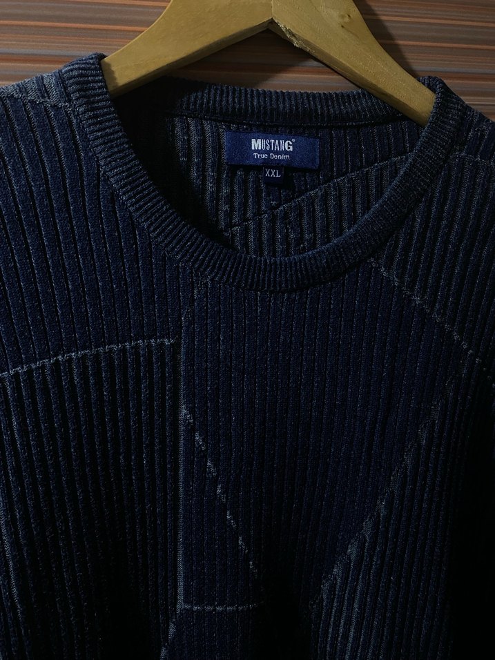 desen içermeyen, mavi denim triko erkek kazak. Yuvarlak yaka ve uzun kolludur, rahat kesimi ve normal boyu ile günlük kullanıma uygundur.