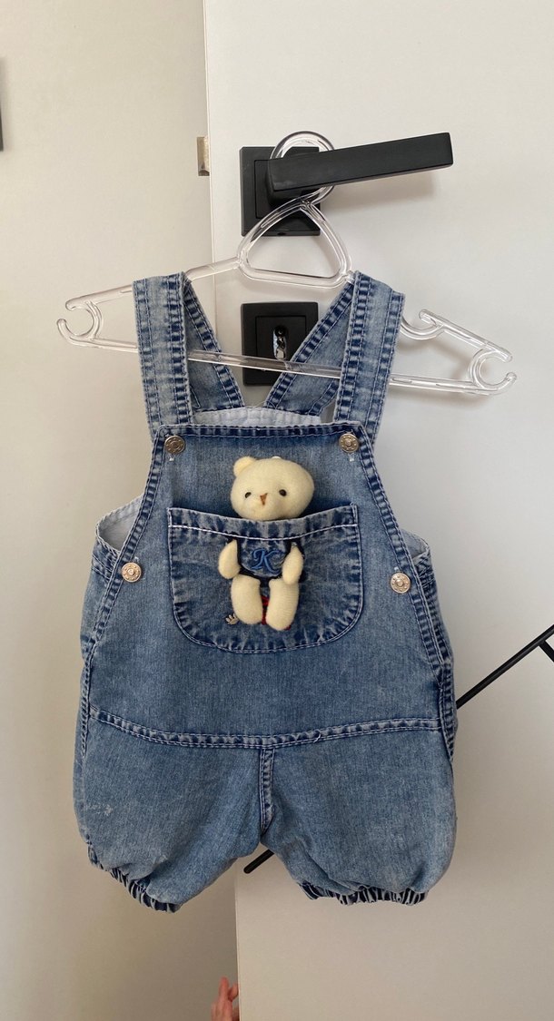 3-6 ay mavi renkte, ayarlanabilir tokalı askıları ve ön cepleri olan, küçük bir oyuncak ayıcık detaylı unisex bebek fit kesim denim tulum.
