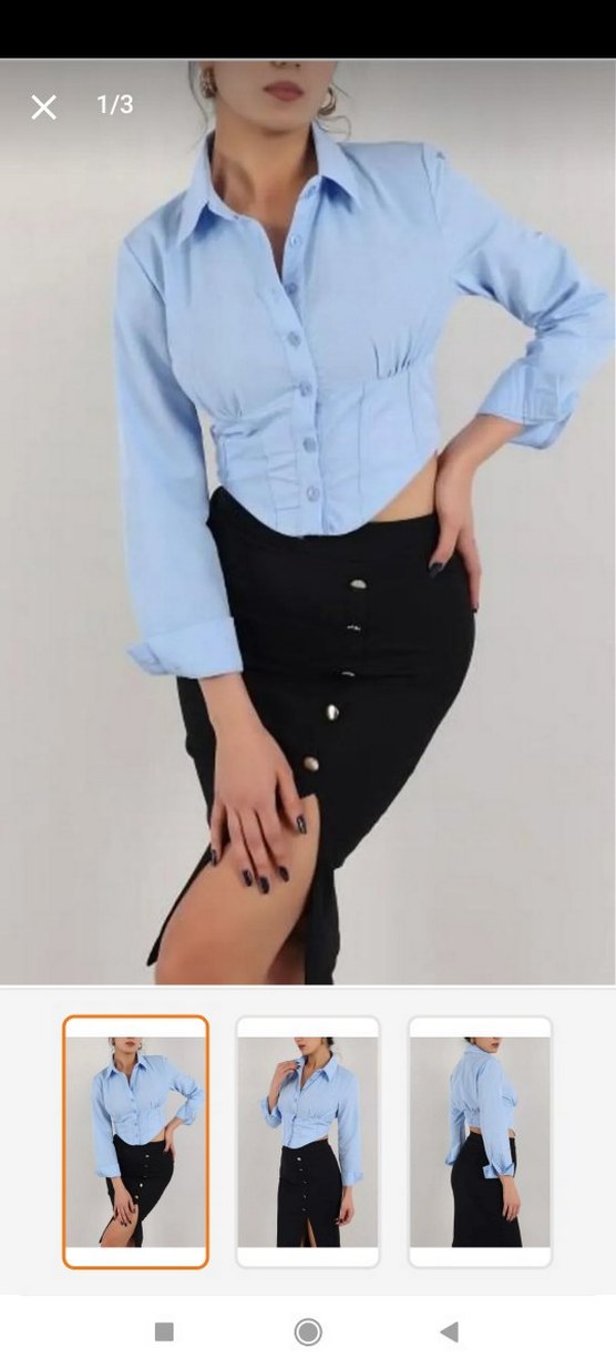 Pastel mavi denim kumaştan, uzun kollu, V yakalı ve düğmeli ön tasarıma sahip, ofis için trend günlük şık gömlek.