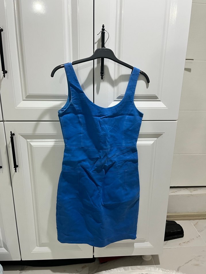 Kolsuz, mavi denim mini elbise, v yaka ve dar kesimiyle minimalist ve şık bir sokak stili sunar.