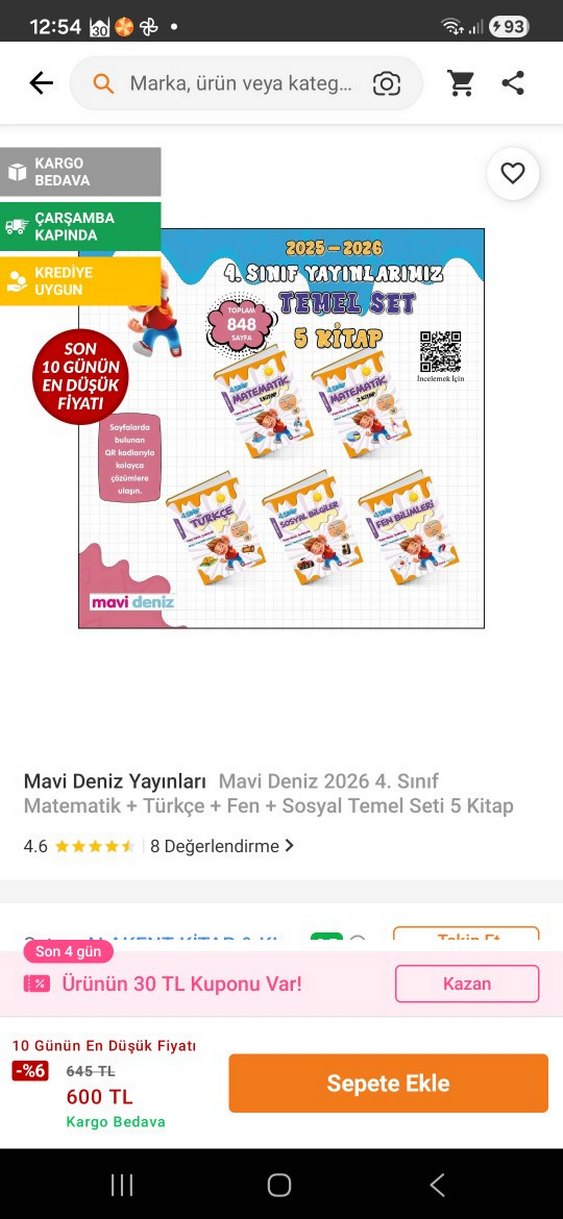 Mavi Deniz yayınevinden 4. sınıf için Matematik, Türkçe, Fen ve Sosyal derslerini içeren 5 kitaplık temel set. Canlı ve açık camel renk kapaklıdır.