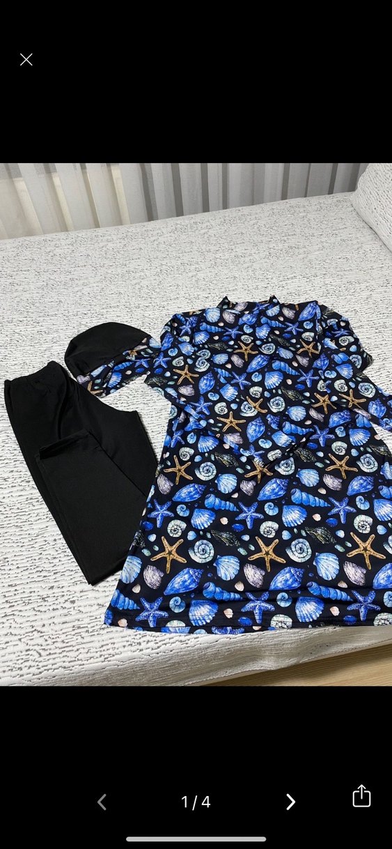 Kısa kollu, bohem tarzda, mavi deniz kabuklu baskılı ve payet detaylı mini boy, vücuda oturan kadın mayosu. Ürün üç parçadan oluşmaktadır bel lastıgı gevşemiş kayma yapmıyor basemlı ınsanlarda tam oturur