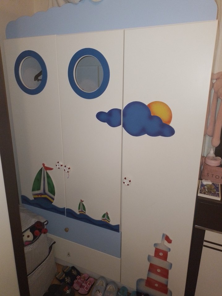 Açık mavi renkte, deniz temalı çocuk gardırop; kapaklarında yuvarlak pencereler ve çeşitli saklama alanları bulunur.
